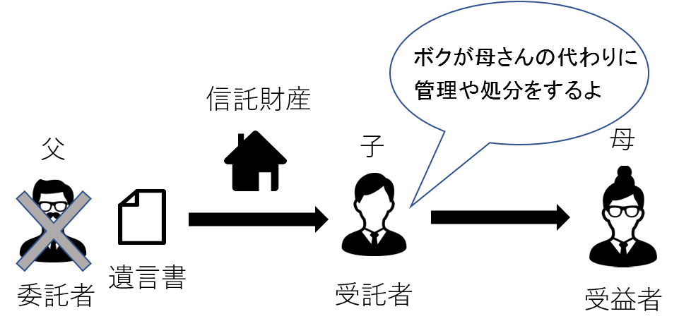 信託の使い方:子を受託者にして財産管理を任せることで、親が判断能力を失っても財産運用や売却が可能。